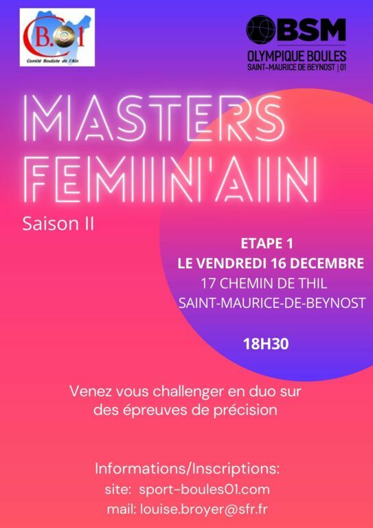 La 1ère étape des Masters Féminins se dérourera le 16 Décembre au boulodrome de St Maurice de Beynost.